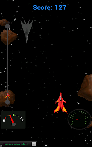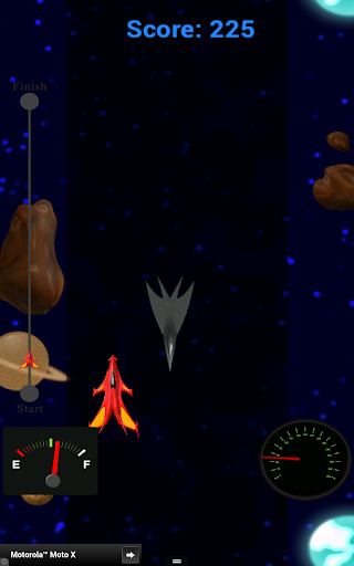 DIRECTIONS: To start your rocket engines, press and hold the screen. Tilt your device to the left and right to avoid crashing. You must catch the fuel cells before your tank runs out of fuel. Keep an eye on the progress meter to find out how much farther you have to go in the level. There are 3 levels altogether. Unlock all 3 levels to play the game any time you want a quick trip around the galaxy.