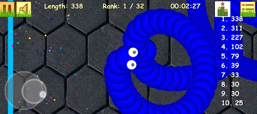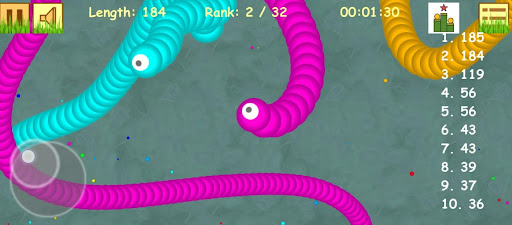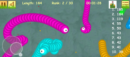 Slide ahead of other snake worm to kill them and eventually eat their light dots.