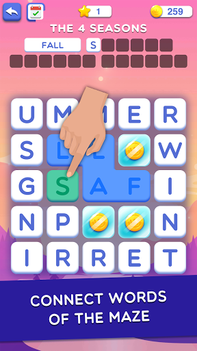 Simply connect words to complete the maze (and free some coins in doing so). Easy at first, it gets challenging fast. How far can you go?