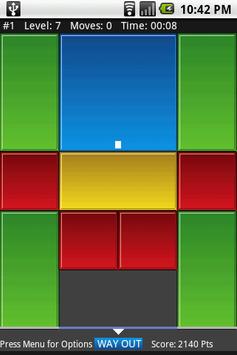 Way Out is a sliding puzzle game with 60 puzzles across 12 difficulty levels. Every puzzle is solvable (we have solutions!). Visit our web site to see the Solution of the Month. No level or puzzle is locked. Points earned can be used to reduce difficulty. You can view the best solution in animation on a solved puzzle.
