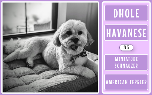 The game includes virtually every known dog breed including visla, pitfall, airedale, spanish waterdog, beagle, pug, dachshund, scottish terrier, kelpie, rottweiler, groenedael, Japanese spaniel, dobermann, whippet, dalmatian, french bulldog, golden retriever, corgi, dhole, border collie, American terrier, chihuahua, toy terrier and lots more!