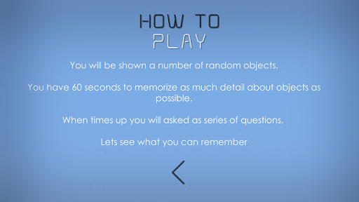 The aim of the game is to remember random and objects, and test your memory by answering a series of questions about the objects.