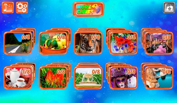 can be found pictures of different topics: road, citrus, animals, bouquets, Venice, teadrinking, leaves, fountains, carnival, canyons. By choosing one of 10 categories you can see pictures, which can be collected. In game you can choose game's difficulty level by your own: