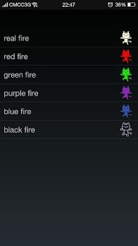 Click on the application icon, the icon will be issued at the flame. You can choose your favorite color of flame flame by pressing the Menu key to enter the selection list. Before clicking the icon, no matter where you move the icon, the flame will burn the cat's body. Then you can use your mouth to blow out the flame pretend acting, but in fact the flame is extinguished by you press the volume button on the phone. You can use it to perform in front of friends fun mobile magic. Enjoy them astonished. Wish you have a happy time.