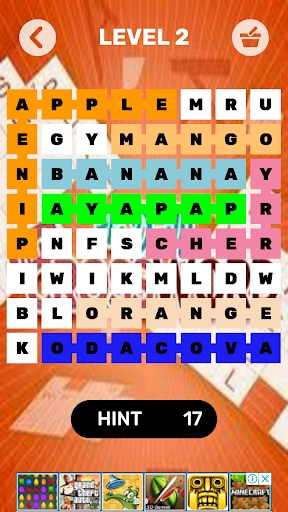 a word, the connection could be vertically, horizontally, in a zig-zag form, square shape, rectangular shape for your maximum fun. Once all the words are unveiled, a level is completed and you will move to another level.