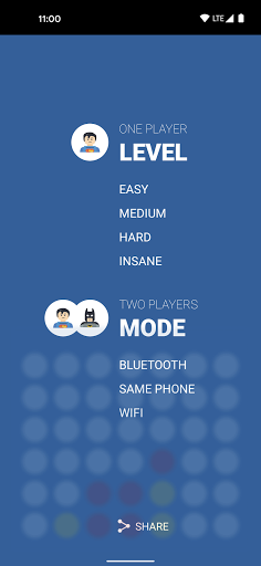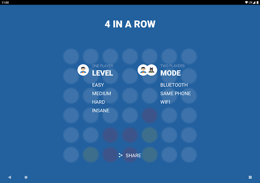 - One Player : Challenge your mind by playing against Artificial Intelligence. There are 4 levels of difficulty : Easy, Medium, Hard, Insane. Will you be able to connect a 4-in-a-row before our smart AI?