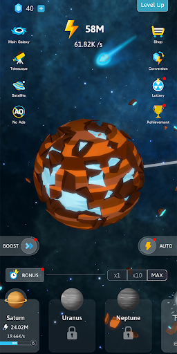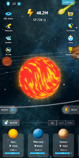 Start with the BIG BANG and tap to create your own universe. In Idle Galaxy Creator, you will create Sun, Mercury, Venus, Earth, Mars, Jupiter and so on, you will have the entire solar system and even the entire universe.