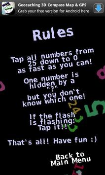 The rules are simple: Tap all numbers, starting from 25 down to 0 as fast as you can! But be careful: If you tap the wrong number, you get 2 seconds penalty time! And to make it even worse: One of the numbers is hidden by a question mark, but you don't know which one. One more thing: If the flash is flashing: Tap it fast! This gives you a 5 seconds bonus time.
