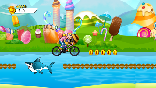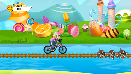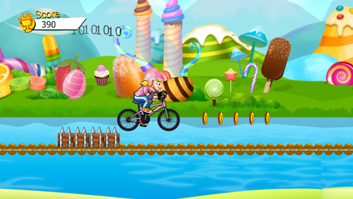 Princess ride bike. Jumping over the monsters, collect the coins. Collect all the coins to make the maximum score.