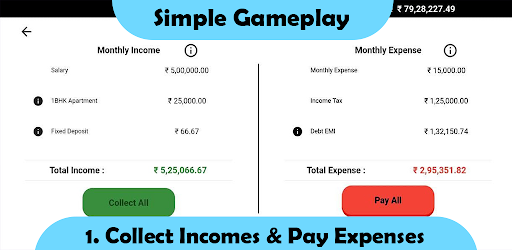 Pay expenses, Collect Incomes, Pay off loans, manage cashflow, Buy Stocks, invest in share market, real estate, mutual funds, fixed deposits and recurring deposits and get to know how to play the money game in real life.