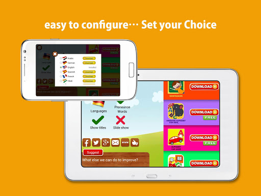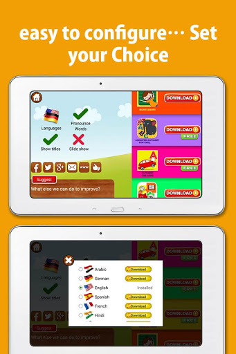 Kids Zoo animal sounds and animal pictures app supports French Spanish and Hindi languages.