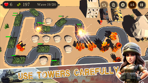 Show off your masterful tactics in this competitive 3D tower defense PvP game. Defend your kingdom from the tank hordes in this epic 3D tower defense game set in World War II! You are a new commander in the midst of the war. You're just a soldier, but your mission is to protect your kingdom from the enemy tanks. Use your strategic skills and battle tactics to build and upgrade lots of artillery units in 3D. These include Machine Gun Towers, Cannon Towers, Sniper Towers, Speed Bumps, and Radar Towers. You can also use power-ups like mines and teleport holes to defeat the enemy.