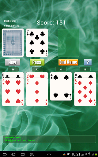 21 Solitaire Game. Combines some of the skill of Blackjack with the simplicity of solitaire. Score as high as you can. Play until you run out of moves.