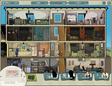 Your virtual family are energy wasters! Help them by turning off lights and appliances before the whole house overloads!
