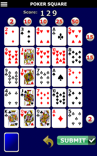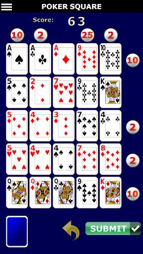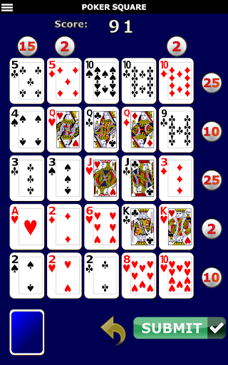 The grid already has 25 cards placed, rearrange them to form the best possible poker hand on each of the 5 rows and columns. When you are finished press submit to end the game.