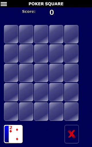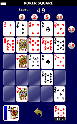 Poker Solitaire is a collection of 5 games which are a combination of poker and patience/solitaire. The objective is to place and arrange cards on a 5x5 grid so that the rows and columns form the best possible poker hand you can make. Each line with a valid poker hand is given a score based on how good the hand rank is.
