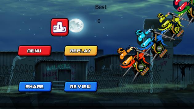 The more you move ahead ,harder the level,fast speed and lots of zombies and obstacles!