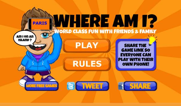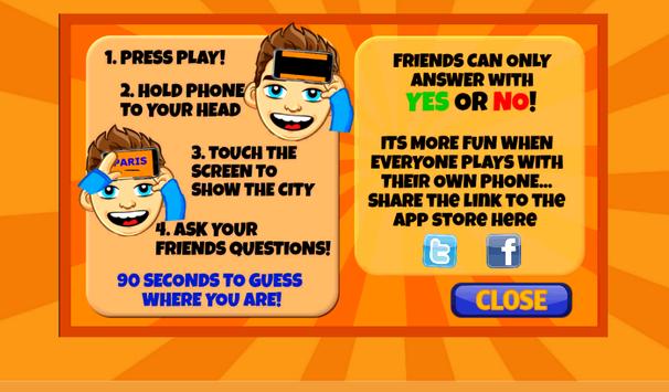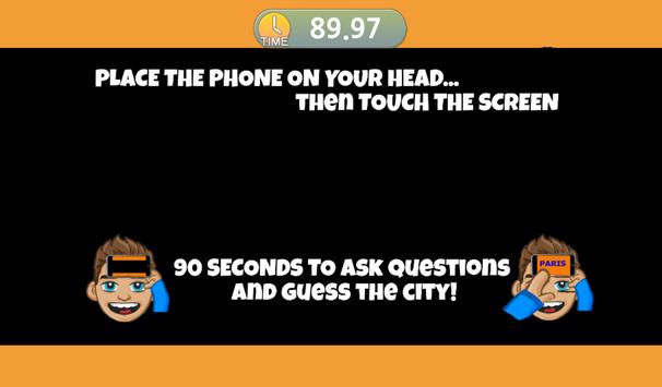 Great fun with friends or family with this awesomely simple free CITY guessing game. Test your geography skills and guess where you are with a little help from your friends! To play just press PLAY and put your phone to your forehead to display the city name for all your friends to see. You've got 90 seconds to ask questions about where you are and guess the correct city! Sounds easy...but as the clock ticks down the pressure rises...so let the fun begin...install Where Am I? FREE now!