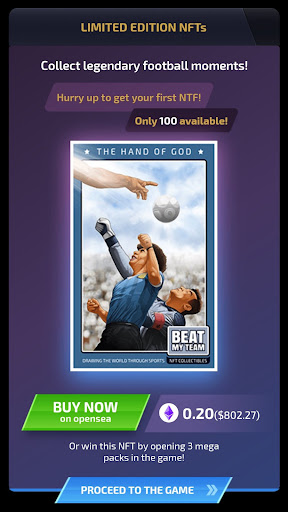 Play BEAT MY TEAM to win rare NFTs that capture football's most legendary moments. BMT is a fantasy football card collecting game, played with randomly generated football player cards who participate in the top football competitions globally. Create the best collection of top scorers, upgrade your player cards to the max, participate in daily contests by drafting the best team and score the most goals. Beat your opponents and shoot up the leaderboards. Play BEAT MY TEAM to win valuable NFTs worth thousands of $$$!