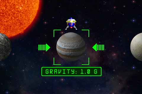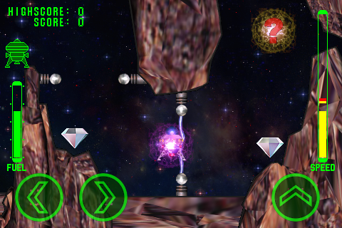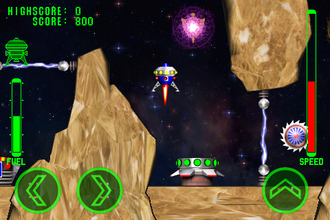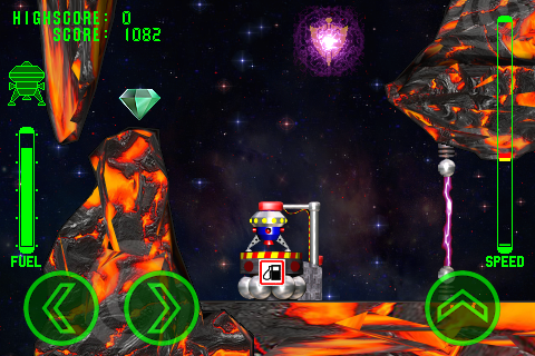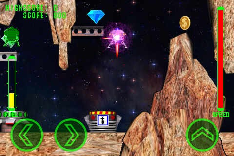 During the flight the ship affects the force of gravity of the planet, be careful when landing and do not exceed the maximum allowed rate of descent. When the rate of descent is permissible, speed indicator is green. At any collision with obstacles or at rough landing your ship receives damages up to complete destruction.