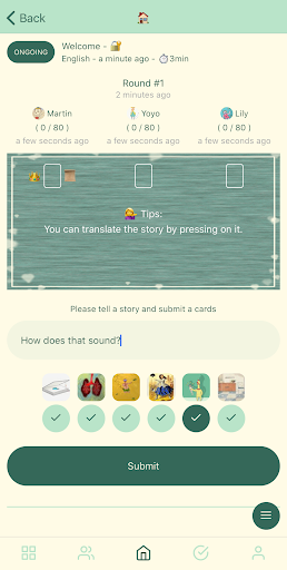 Each other player then selects from among their own 6 cards the one that best matches the story told by the storyteller. Then, each player submits their selected card, without showing it to the others. All cards are shuffled and then dealt face up. The players (except for the storyteller) then secretly vote for which card was the storyteller's. No one can vote for his or her own card.