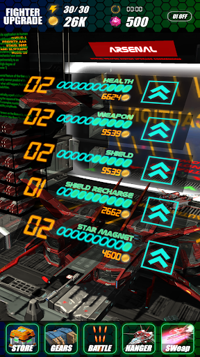 Galaxy Storm is a space shooter arcade style game. There are 50 main stages featured with waves, bosses, power ups, pickups, and special weapons. Each stage has normal, hard, expert, and nightmare difficulties. There are 14 unlockable space fighters, each with unique characteristics. Each space fighters has 5 upgradeable specifications. There are also 5 types of special weapons player can use with 8 upgradable specifications. Players need to use stars they collect from gameplay to unlock space fighters, special weapons, and upgrades.