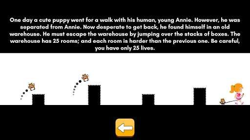 One day a cute little Puppy went for a walk with his human, young Annie. However, he was separated from Annie. Now desperate to get back, he found himself in an old warehouse. He must run the warehouse by jumping over the stacks of boxes. The warehouse has 25 rooms; and each room is harder than the previous one. Be careful, you have only 25 lives.