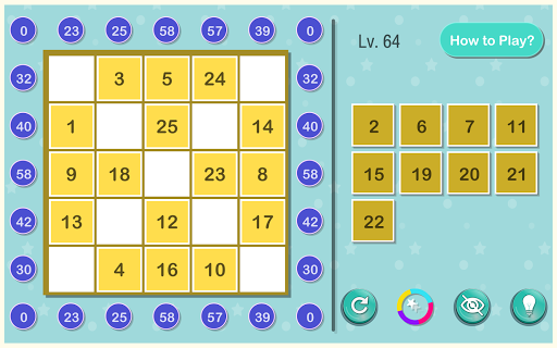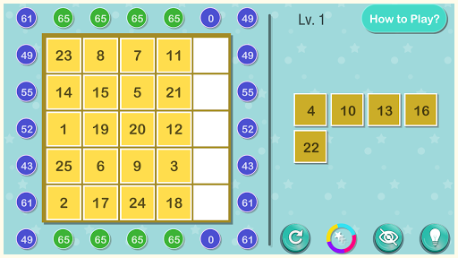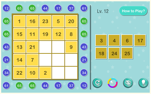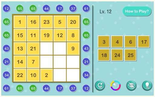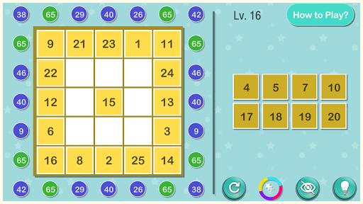 Drag the right side squares into the blank area on the left side, make all the sums around the magic square correct. In 3*3 magic square, the sum is 15, 4*4 is 34, 5*5 is 65.