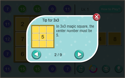 Remember To Learn the Tips provided on the Help Panel, I am sure that will be very useful for you. Currently, the tips are only designed for 3*3 Magic Square and 4*4 Magic Square.