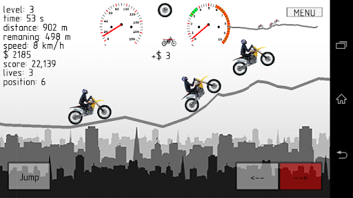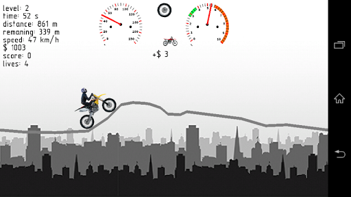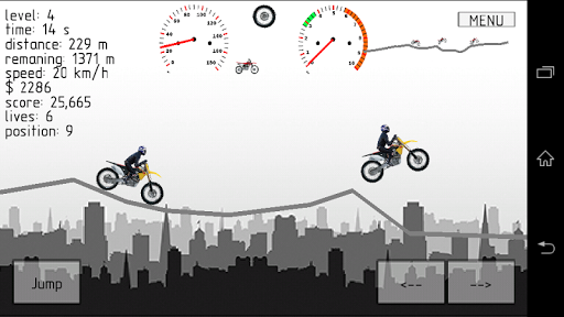 Controls the movement of the rider who races on a motorcycle full of dangers and obstacles routes. In this game for Android you will be able to demonstrate mastery of a motorcycle in extreme conditions. You'll have to jump over deep precipices, jump over obstacles, using trampolines. Perform complex tricks, such as flips and get bonuses. Overcome all the tracks in the minimum time.