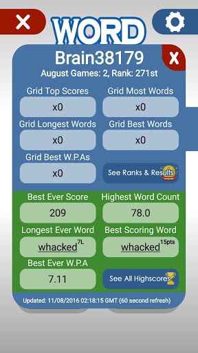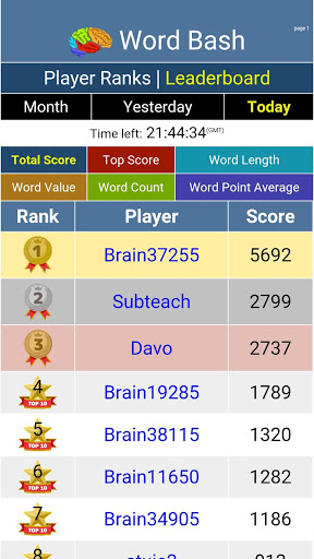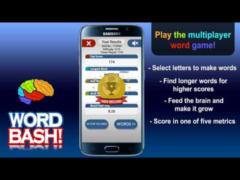 Word Bash is a great word game challenge. With a premium dictionary of over 110,000 words you will find most available in your task of feeding the brain. Spell longer words for more points and grow the brain. Compete against other player scores on the daily and monthly high score tables. Check your stats to see your best scores how many words you can bash out!