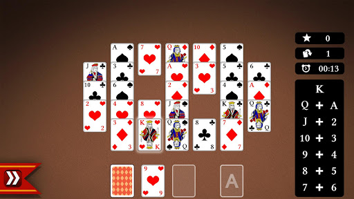 The goal of Pyramid Solitaire is to collect cards in pairs to make them disappear. The sum of the pairs must equal 13 points. When all the cards are eliminated, you win the game!