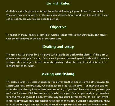 Go Fish is a simple game that is popular with children (my 6 year old son for example). There are many variations of it, the rules here describe how it works on this website. It may not be exactly the way you are used to playing.
