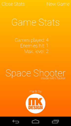 A space shooter made with Tasker for Android. It is a pretty simple but nonetheless fun game. It is round based - so set your ship to a new position and shot where you think the enemy ship will be and hope you don't get hit!