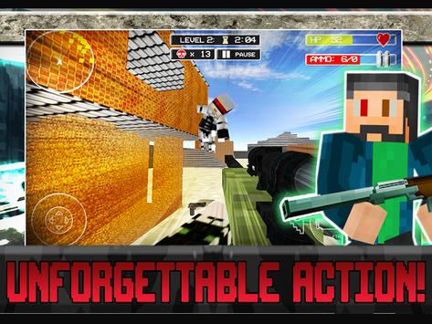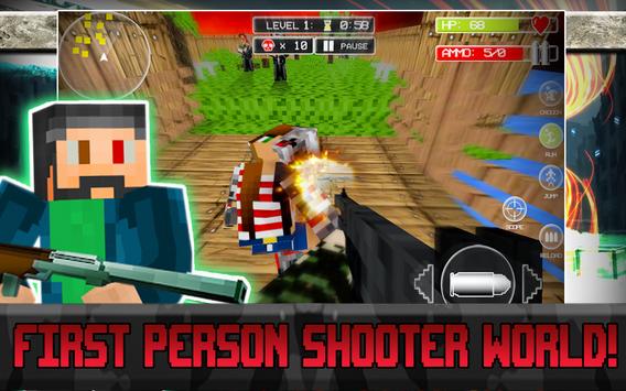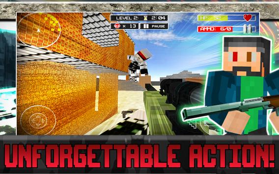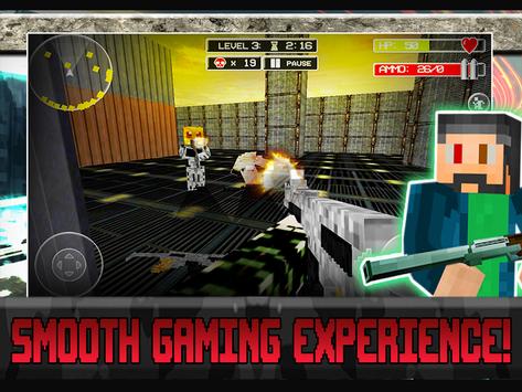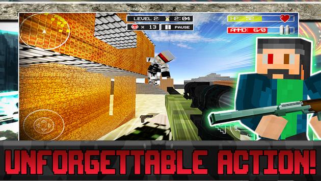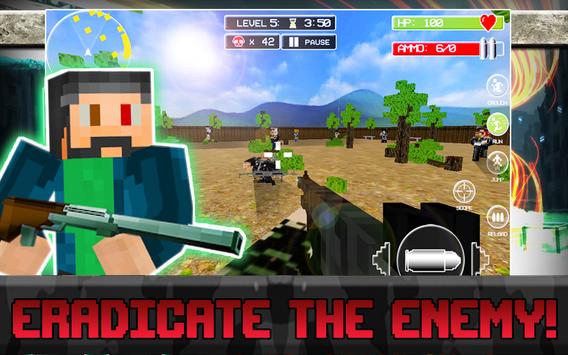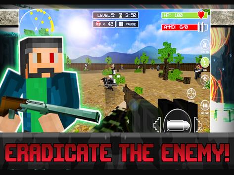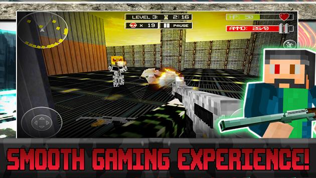 Eradicate the enemy! Become the hero in this bleak FPS world. Launch the game and collect your daily reward. This power up will be yours until you die and you'll earn it by watching a brief video clip. A new menu screen boasts a settings screen and user friendly interface will make for a smooth gaming experience. Game timers will up the danger factor with a fun added challenge. Beat the clock and earn a mega permanent weapon. Each level is full of dangerous enemies who lurk around every corner. Enemies claim high health and are not your average enemy. They are vastly more intelligent. Run, jump, aim and shoot with touch pad controls as you collect blocky weapons and essential perks. Watch video clips to earn health and ammo when in dire situations. Be brave and fight hard!