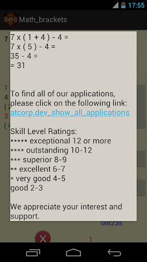 After 60 or 120 seconds, your score and skill level will be displayed.