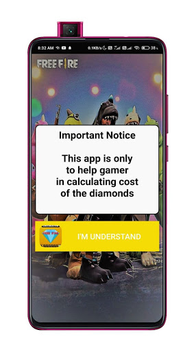 - "Diamond💎Calculator for FreeFire" is only to help fan of game FF in calculating cost of the diamond need. NOT a cheat or hack to get free diamonds in free fire.