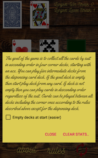 Four corners card solitiare is the well known game which was very popular on Palm OS in decades ago. Now it works for Android platform. Solitiare with two levels of difficulty - with empty start decks and second is the filled decks. The first level is easier to accomplish. Well balanced solitiare which success is mostly depends on the skillls of a player.