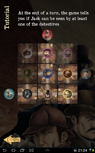 Sherlock's goal is to clear every other investigator until there is only one left: the one Jack is impersonating. In order to achieve this, he will need to have line of sight over his fellow detectives; each night Jack will have to tell if he is currently visible or not, allowing Sherlock to eliminate suspects. On the opposing side, Jack's goal is only to delay the investigation until dawn, when he can escape. Each night, both players will be able to reshape the board in order to shed a dim light on the streets of the city, or to remain hidden in the shadows...