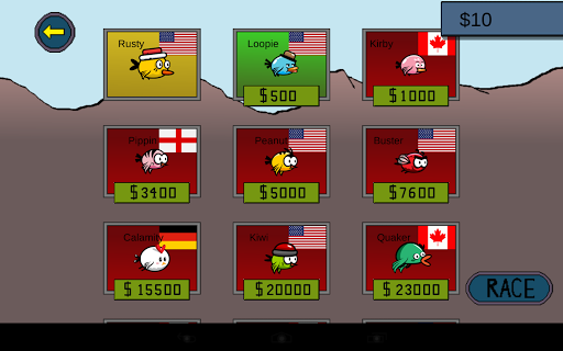 Each race has 12 flappy birds from several different countries which will fiercely fly for victory. Birds come in several different colors and can be purchased with prize money. Each racing bird has their own racing strategy. Be sure to choose the best bird for each race and don't forget to save up for better birds.