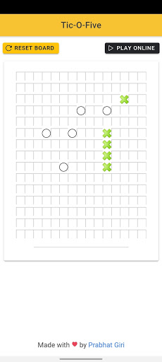 Multiplayer Tick-Tac game with a target to create a sequence of five. Features: 1. Play offline 2. Play online with friends and family