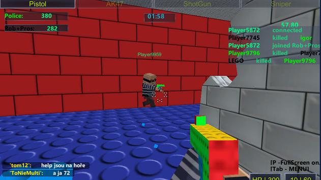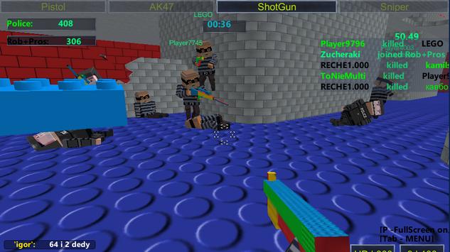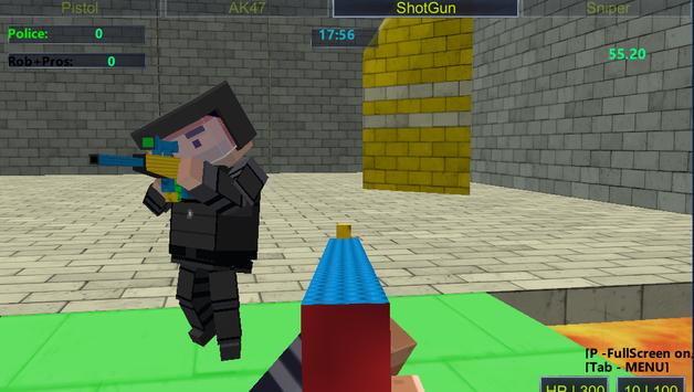 This game uses simple block style graphics and pixel style weapons, can be play by people for all ages. Try Deathmatch and Team deathmatch . Enjoy !!!