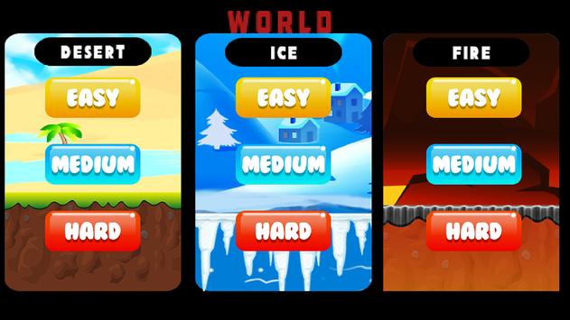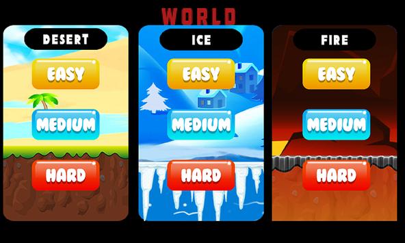 Be cautious while running so that you can clear the world with ease. In this game there are three worlds namely Desert, Ice and Fire and in every world there are three modes easy, medium and hard. Complexity and difficulty increases with modes from easy to hard.