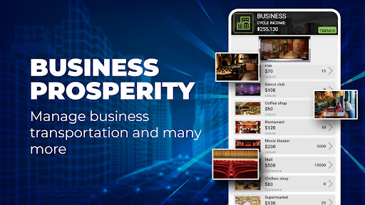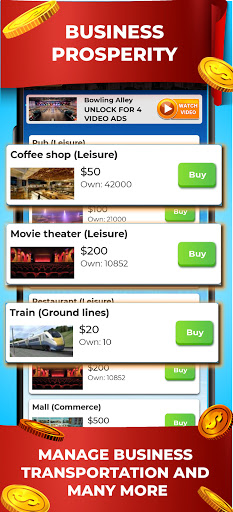 At first, you will have to build some transportation and business assets to gain power and reach a positive cash flow. By achieving that you will be able to earn more money and buy bigger and bigger business assets. From a small neighborhood coffee shop to thousands of malls around your country. From a few taxis driving around town to thousands of passenger planes covering the whole world. To grow your business diversity and span, buy concessions to buy more businesses and transportation.