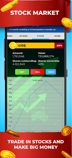 Make alliances around you and group together with strong companies to work together and make an impact on your countries. Big money can lead to global conflicts between countries. This is the place for you to participate and lead your country's global wars and resolutions.