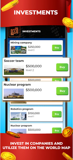 The next step for growing your company will be to earn money by investing in various activities like Soccer teams, traveling companies, space centers, and much more. Use your investments wisely and visit different locations around the world to make profits from your investments.