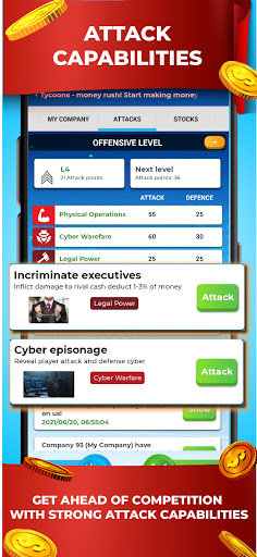 As you grow bigger, you will gain rival companies around you. They will try to apply different actions using different capabilities to harm you and overcome the competition. From sleazy corporate lawyers to cyber experts, when it comes to money everything is legitimate!