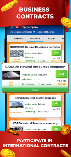 As you grow bigger and bigger, you will want to bid on different contracts. Once you will win some of them you will be able to earn a substantial amount of money or natural resources. Natural resources are also good investments since you can buy them at low prices and sell them when the price is higher.
