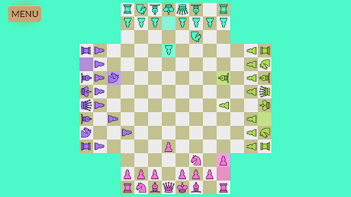Four-player chess is a family of chess variants typically played with four people. A special board made of standard 8×8 squares with an additional 3 rows of 8 cells extending from each side is common. Four sets of differently colored pieces are needed to play these variants. Four-player chess follows the same basic rules as regular chess.