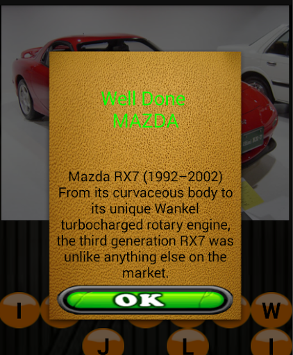 Game plat is also very easy. Each level presents you with small icons of cars just click any car and you will have the full image of the car. Then you will be have to guess the name by selecting from jumbled letters into the blank spaces provide. If you guess it right you get some extra info for your appetite.